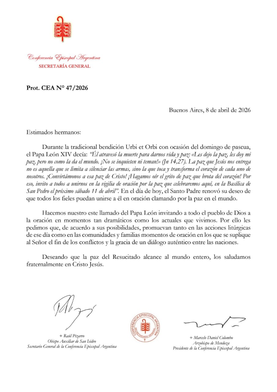 Por eso, nos unimos a esta convocatoria e invitamos a toda la comunidad a sumarse espiritualmente a la vigilia de oración por la paz que se celebrará el próximo: