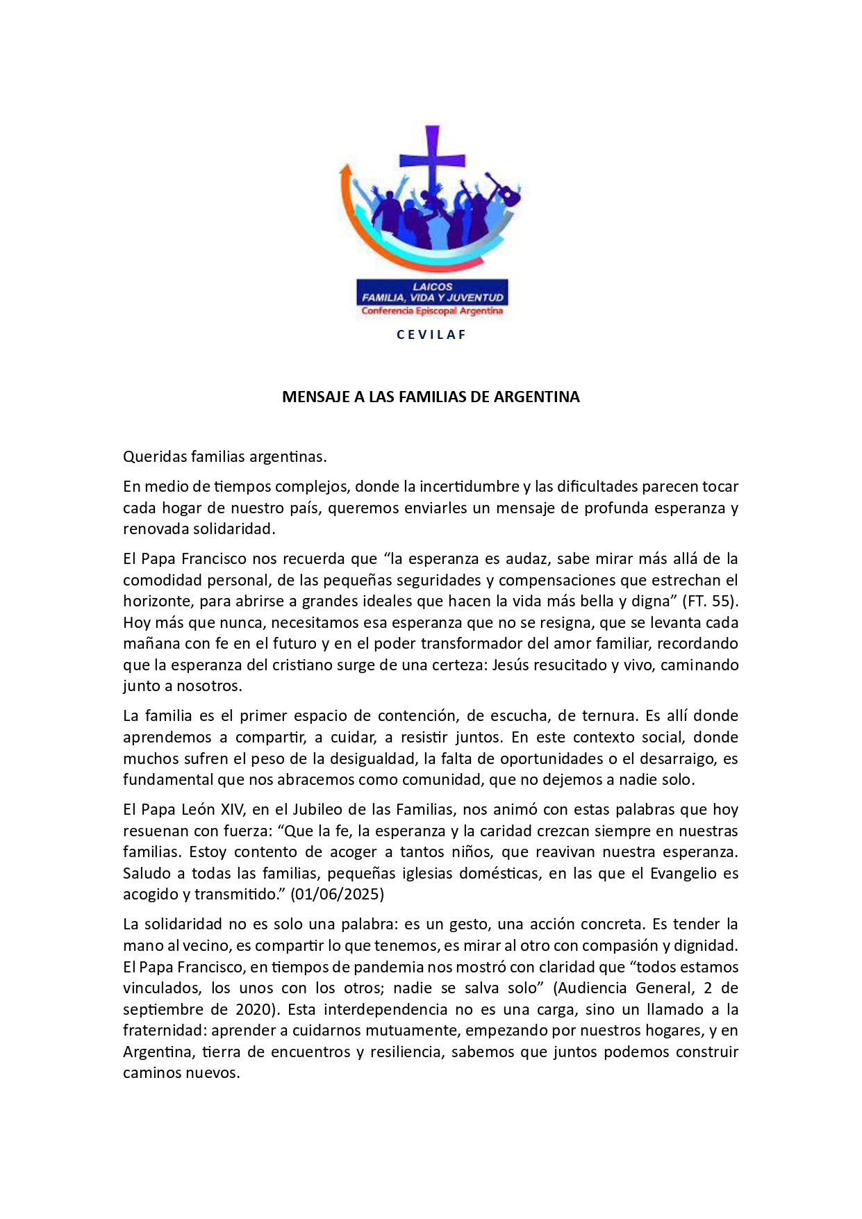 Buscando resaltar el valor de la solidaridad natural que se vive en toda realidad familiar, desde el Secretariado Nacional para la Pastoral Familiar, integrante de la Comisión Episcopal de Vida, Laicos, Familia y Juventud, compartimos el siguiente mensaje en ocasión de celebrarse el domingo 19 de octubre el Día de la Madre.